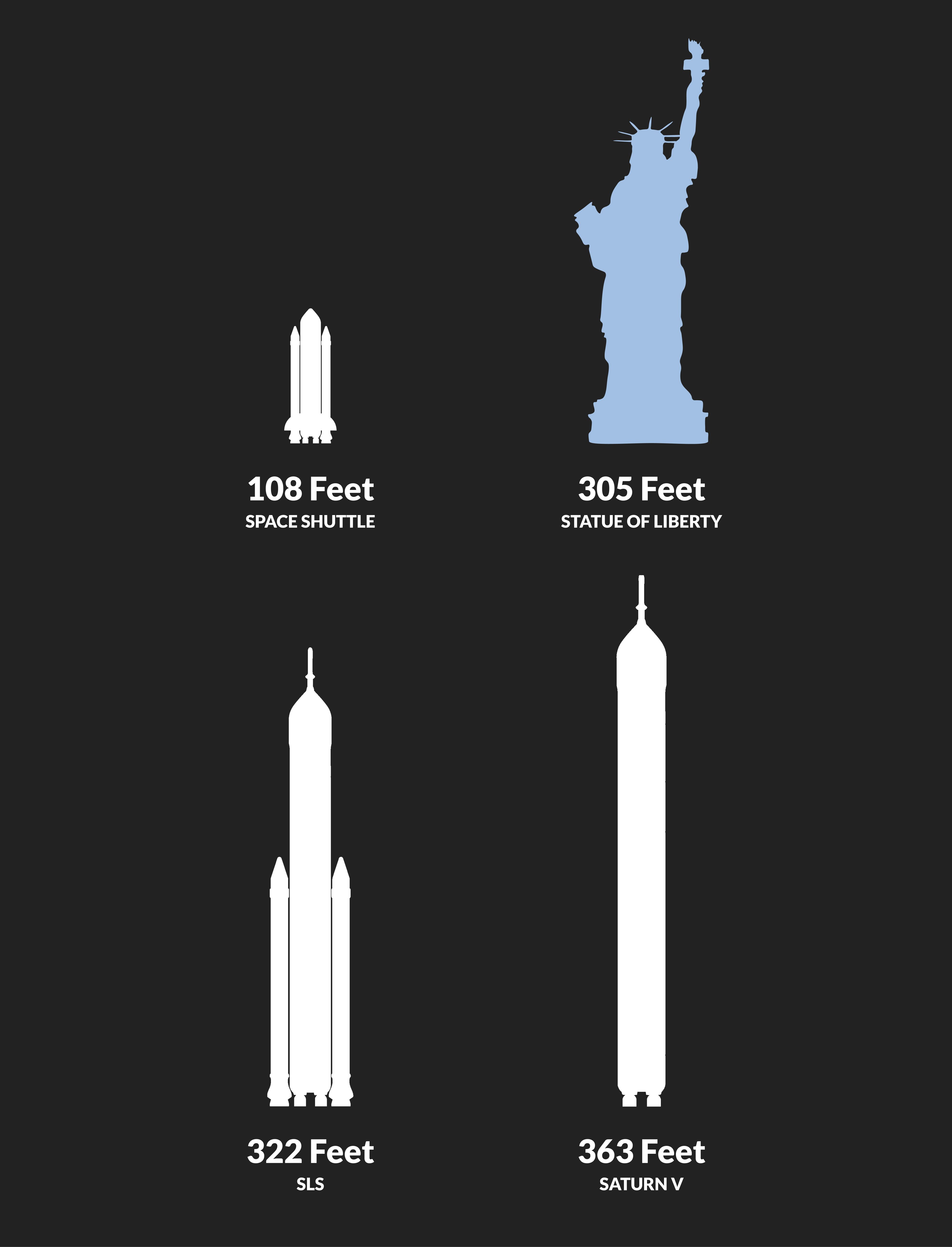 While SLS isn’t as tall as the Saturn V—still the undisputed champ at 363 feet—it is more powerful, producing 15 percent more thrust than during takeoff and ascent thanks to the RS-25 engines and the solid rocket boosters.